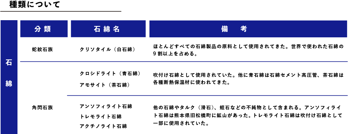 アスベスト(石綿)は、天然にできた鉱物繊維で「せきめん」「いしわた」とも呼ばれています。石綿は蛇紋石族と角閃石族に大別され、以下に示す6種類があります。そのうち、わが国で使用された代表的な石綿は、蛇紋石族の白石綿(クリソタイル)と角閃石族の茶石綿(アモサイト)、青石綿(クロシドライト)です。